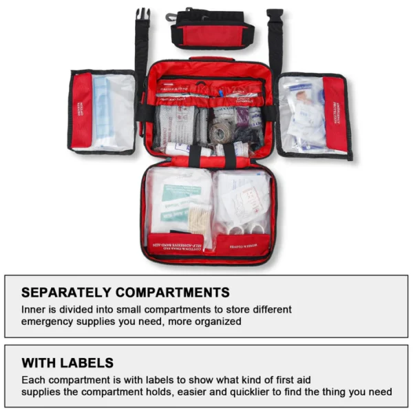 The inner space of the first aid kit for home has been divided into several compartments and each compartment is with label to provide easy and quick access to the emergency supply you need.